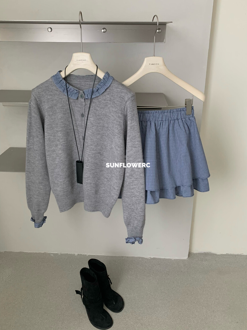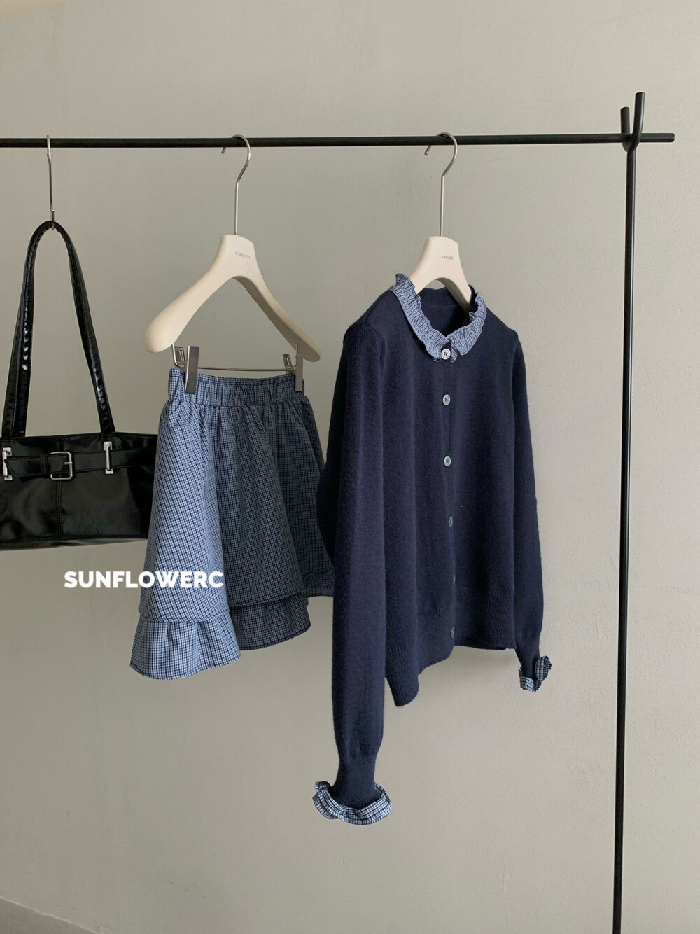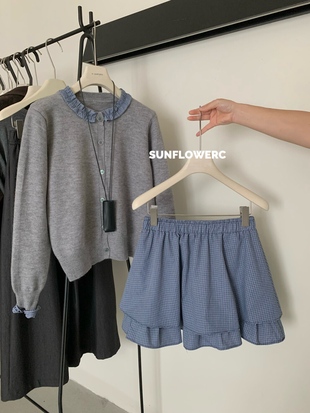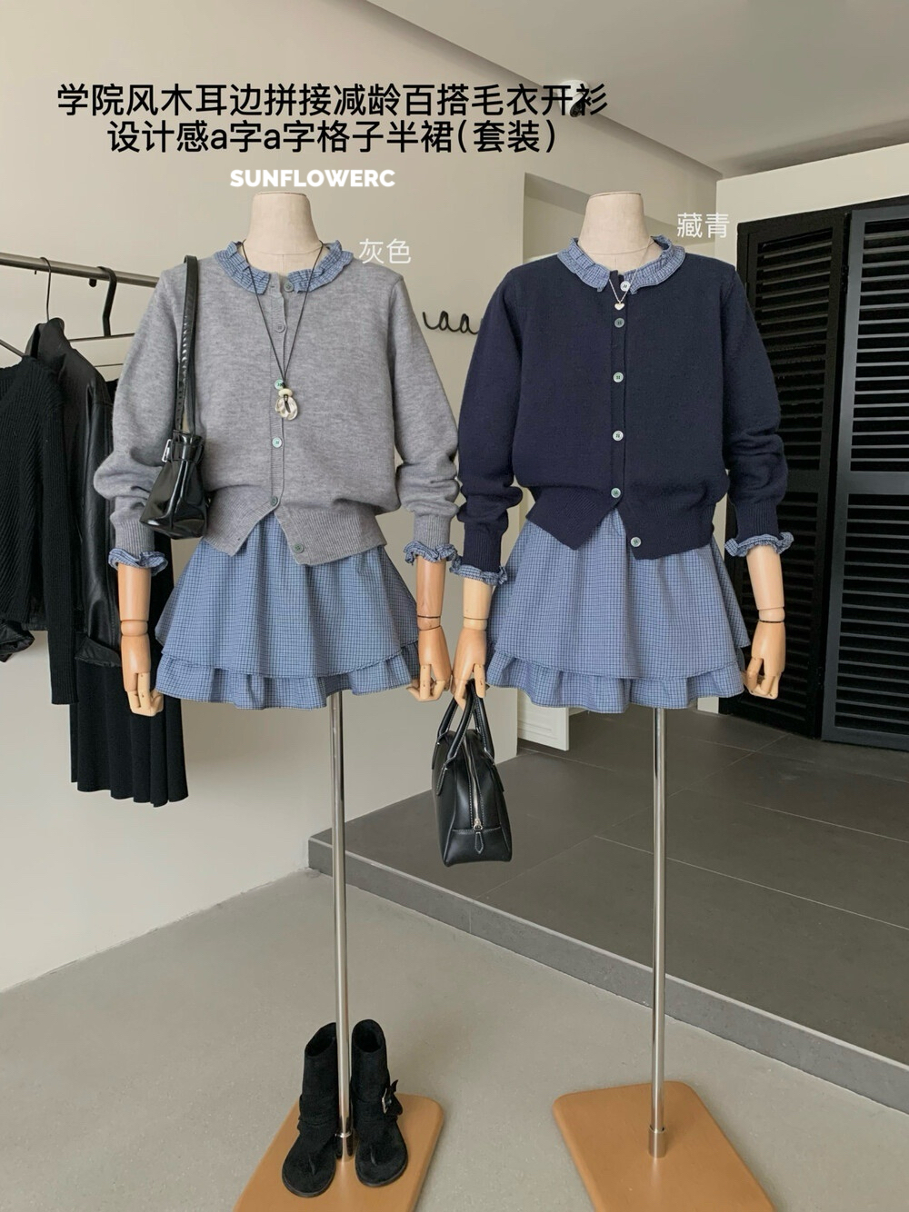A1464 学院风木耳边开衫毛衣+格子裤裙 | 两件式套装