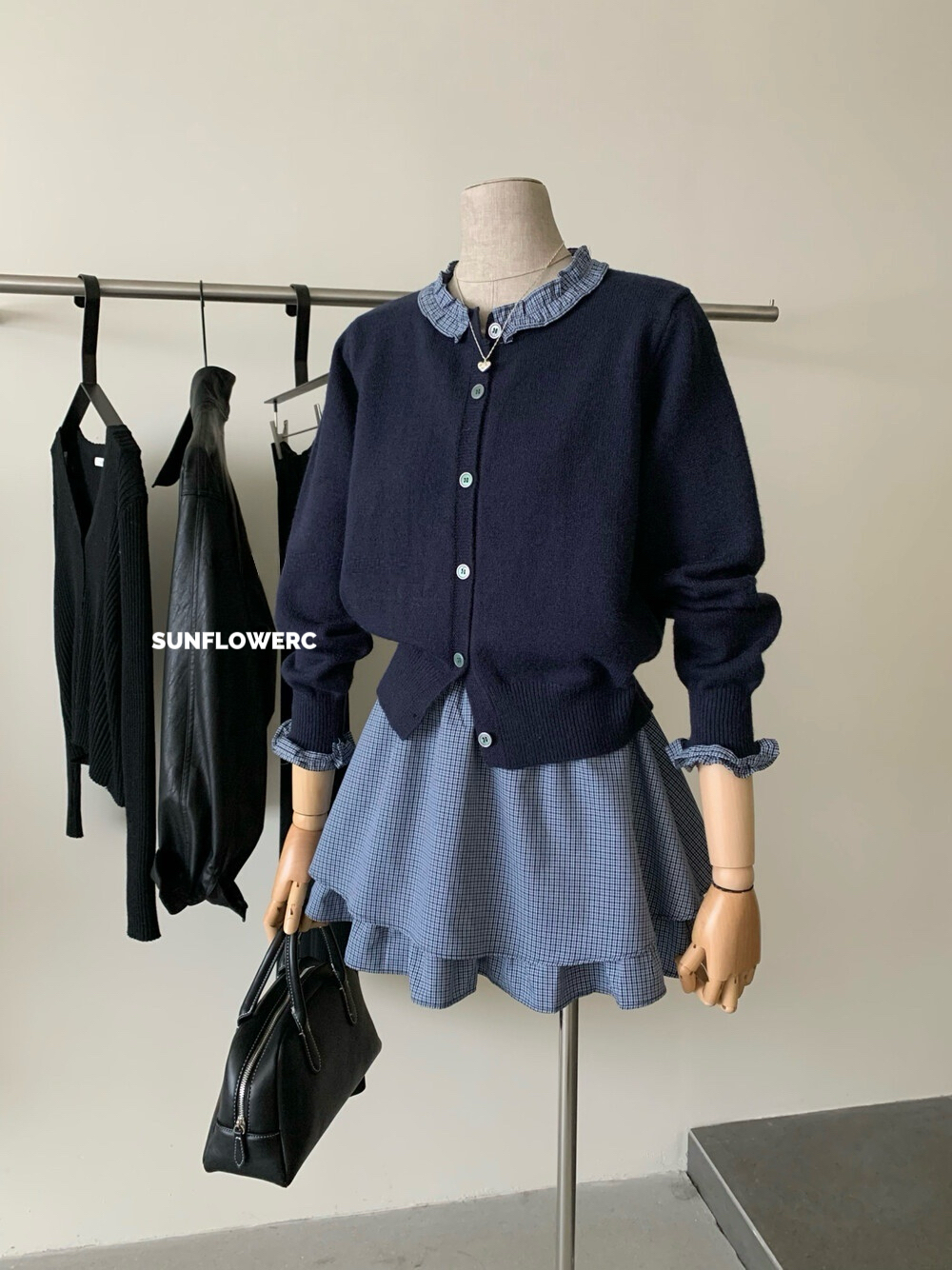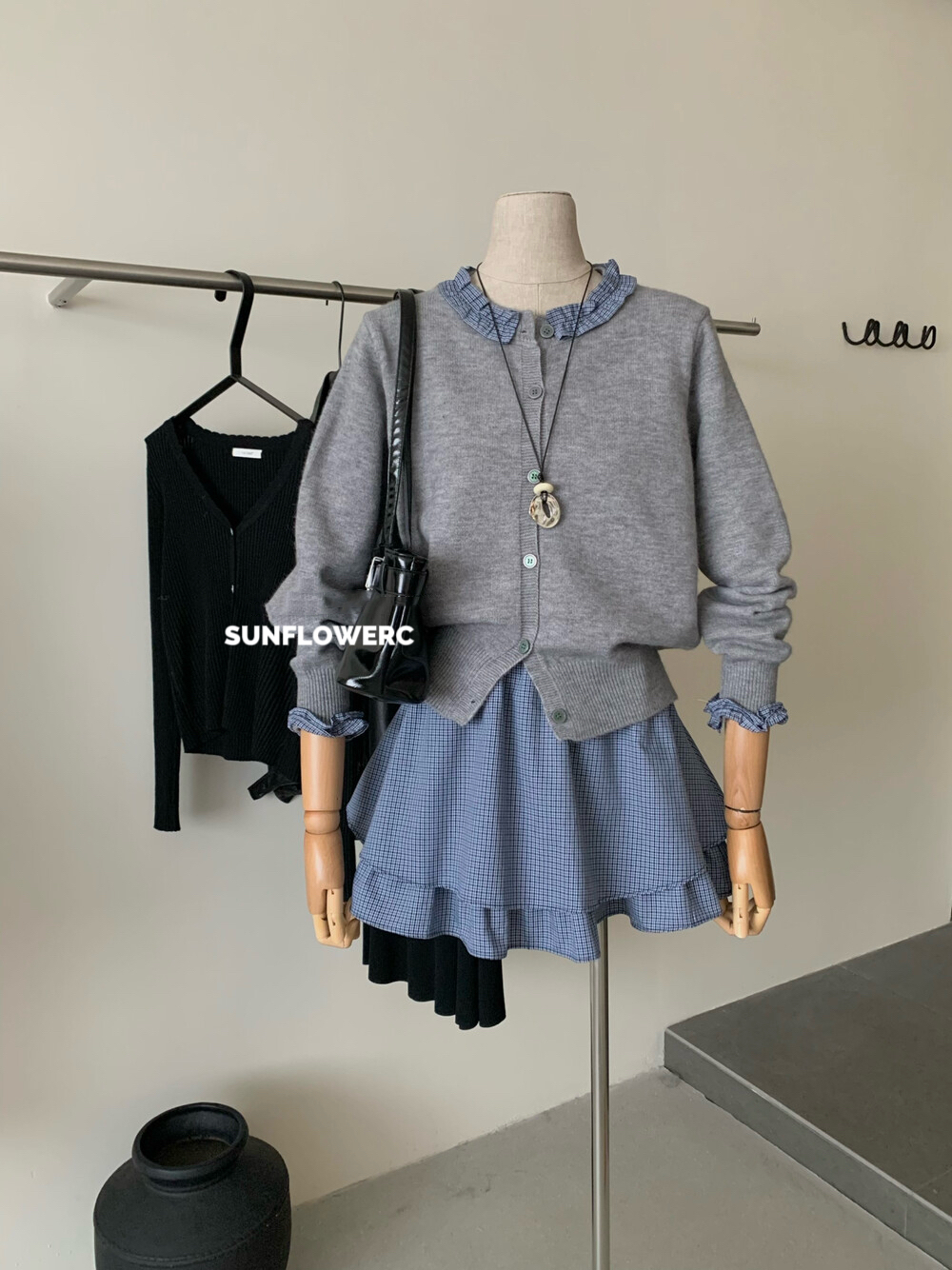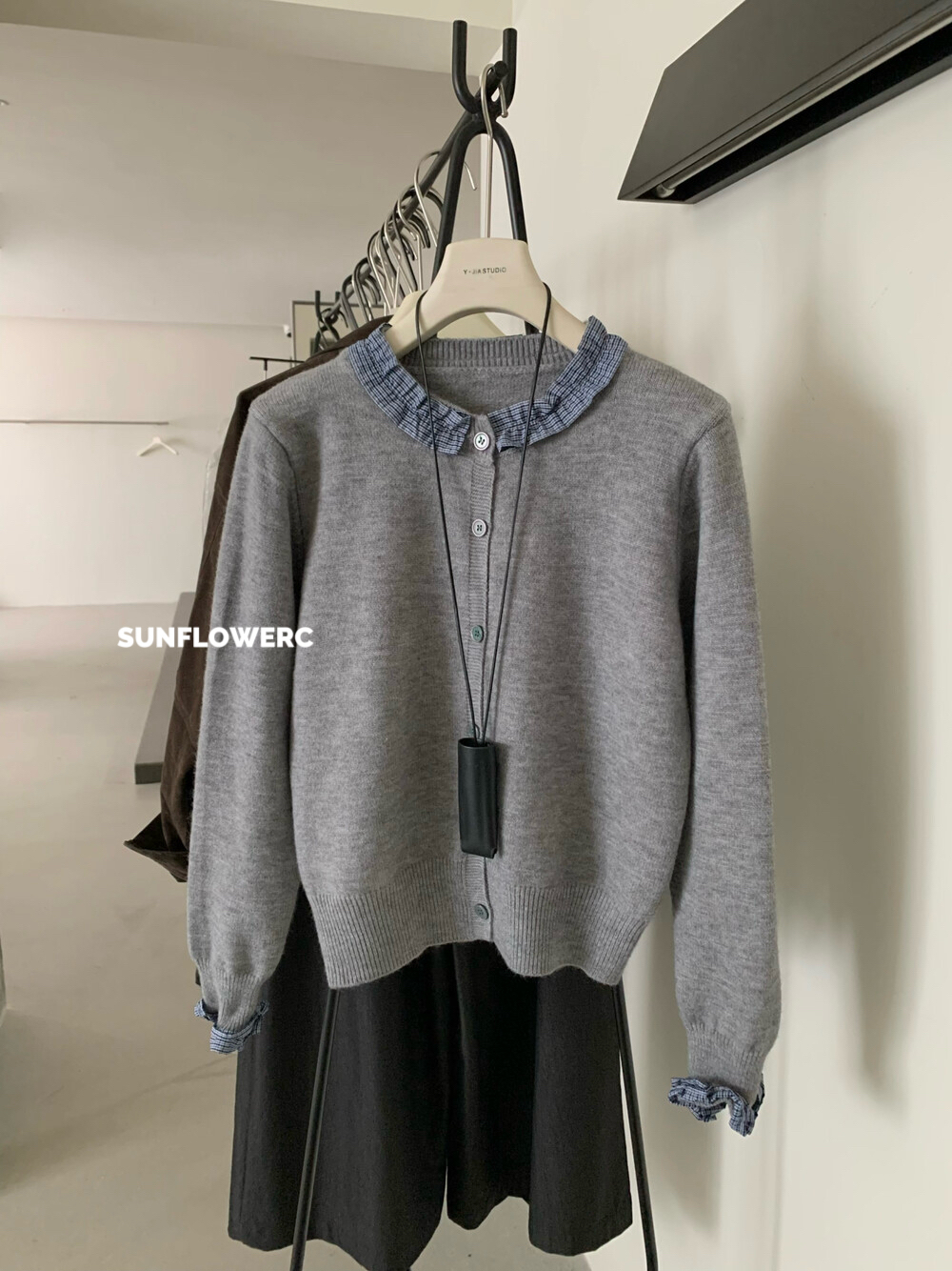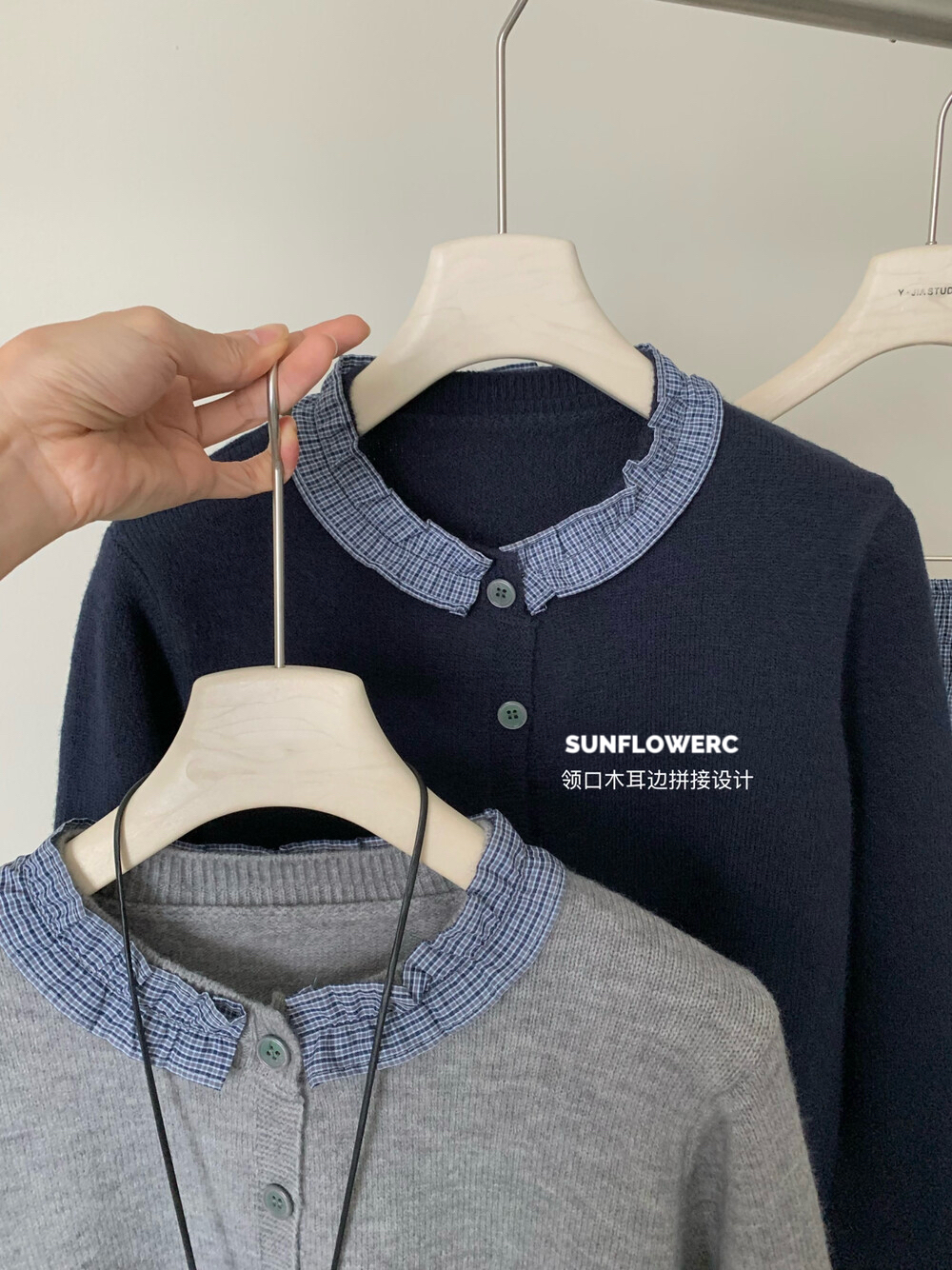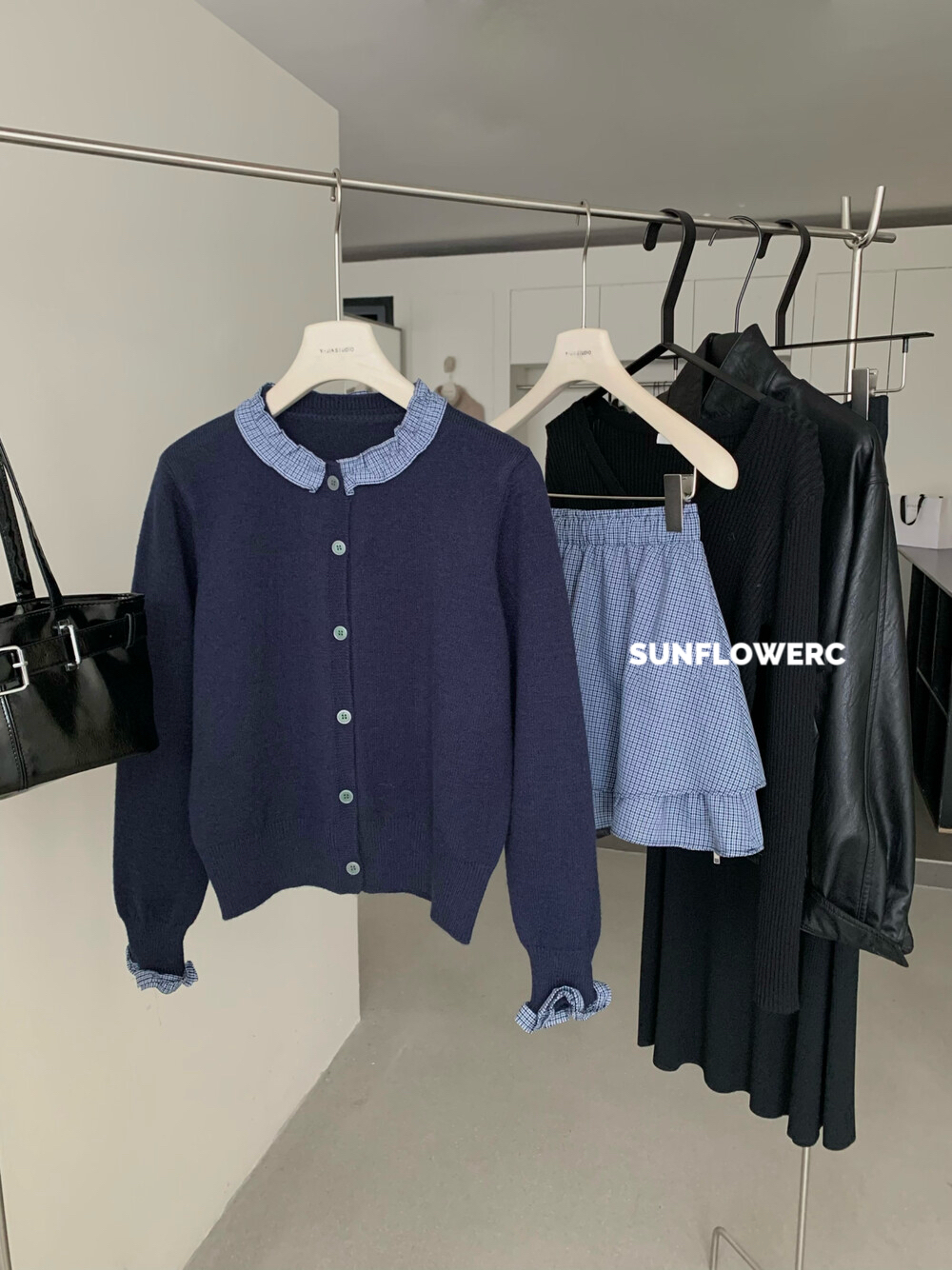 A1464 学院风木耳边开衫毛衣+格子裤裙 | 两件式套装