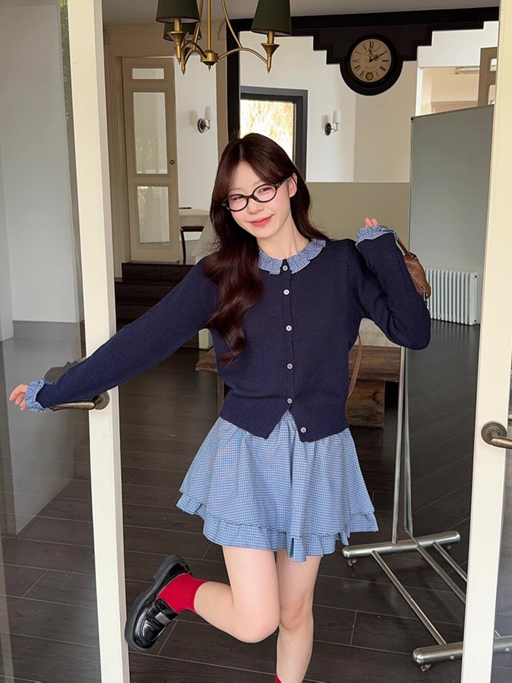 A1464 学院风木耳边开衫毛衣+格子裤裙 | 两件式套装