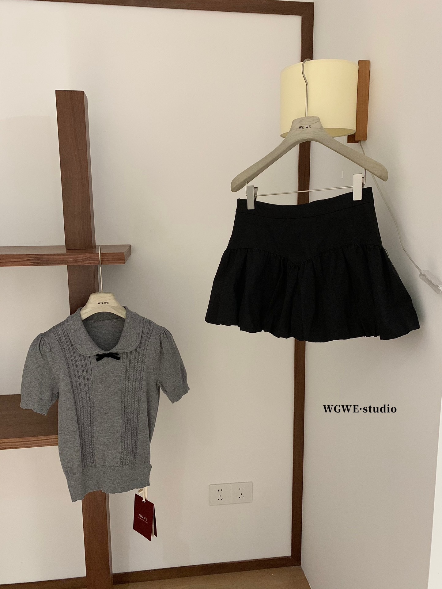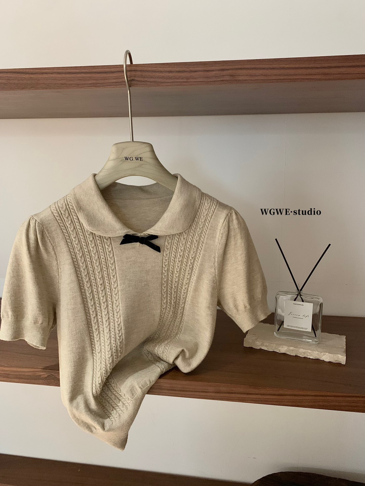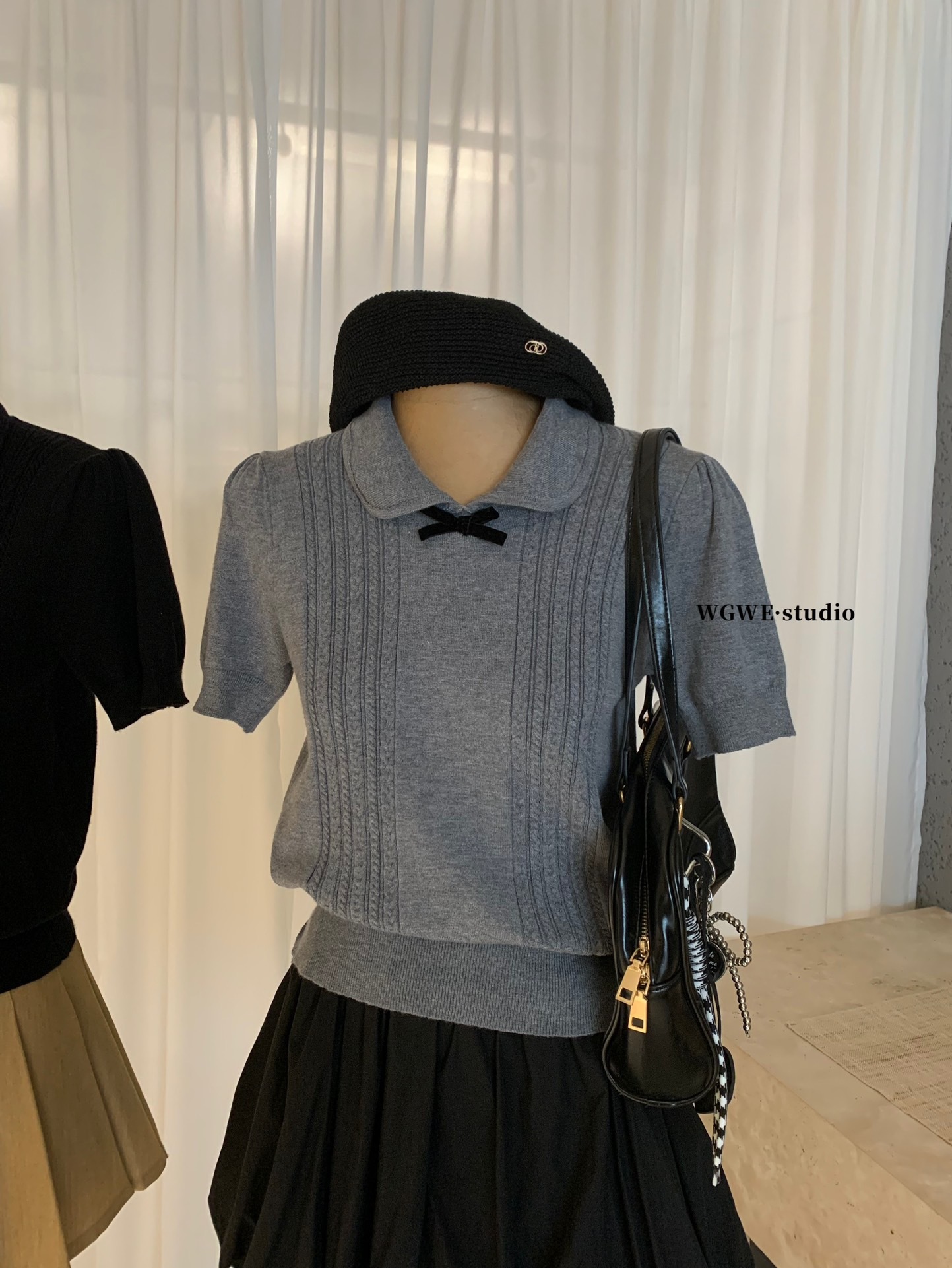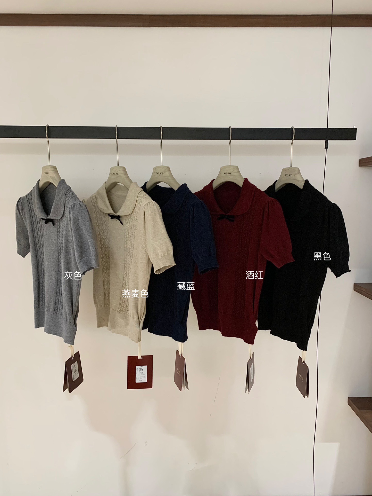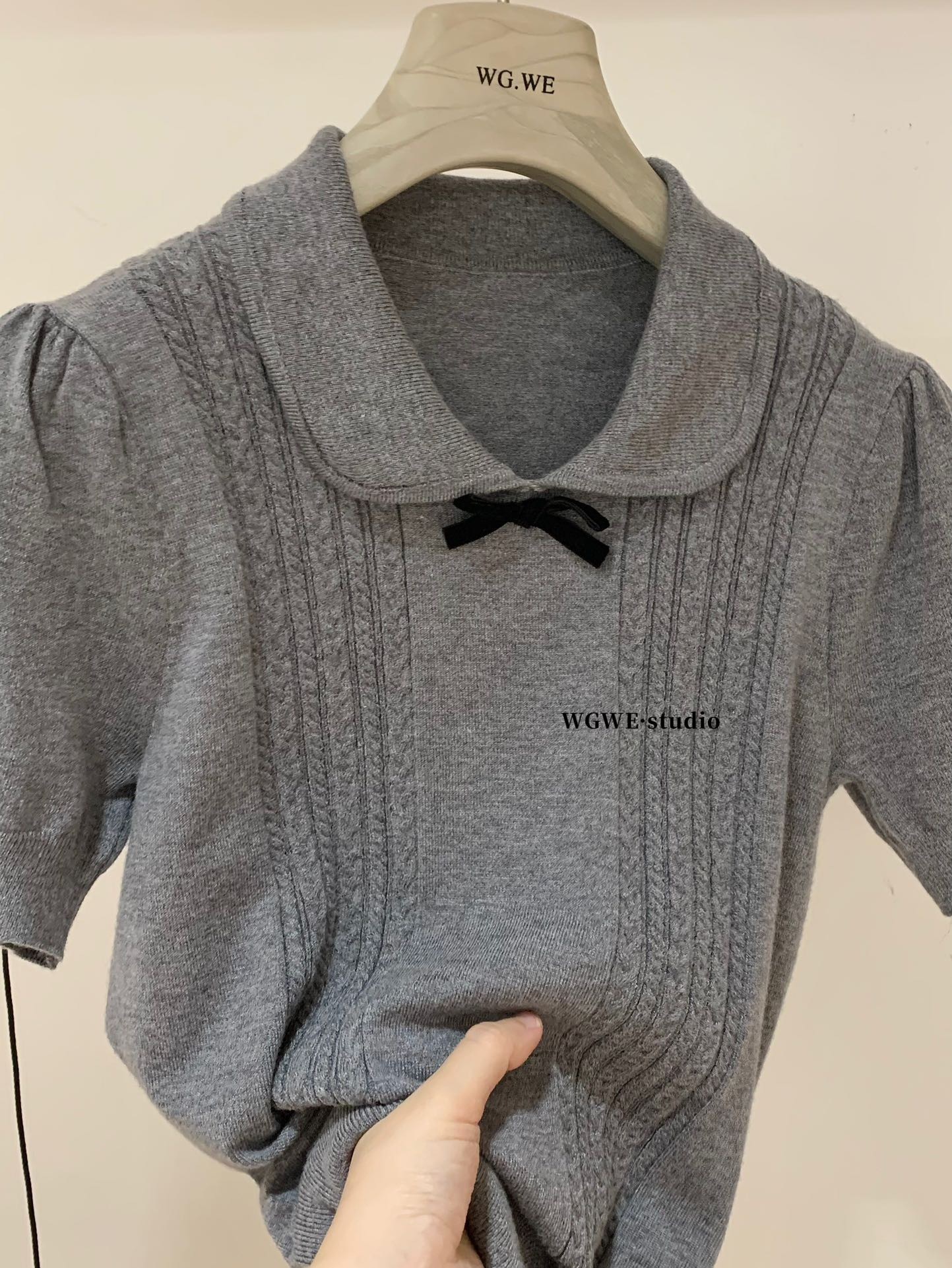 A1723 娃娃领蝴蝶结短袖针织小衫