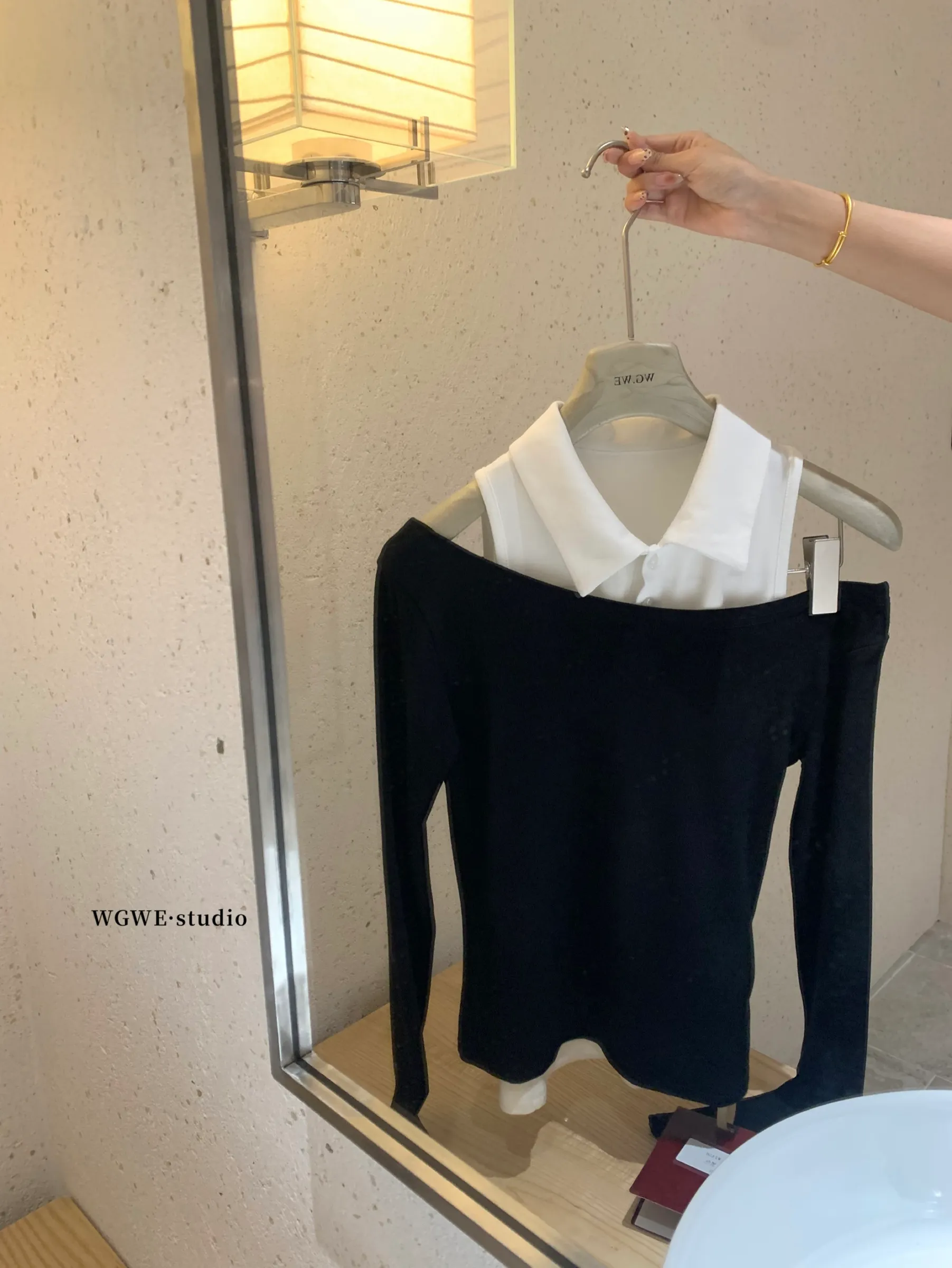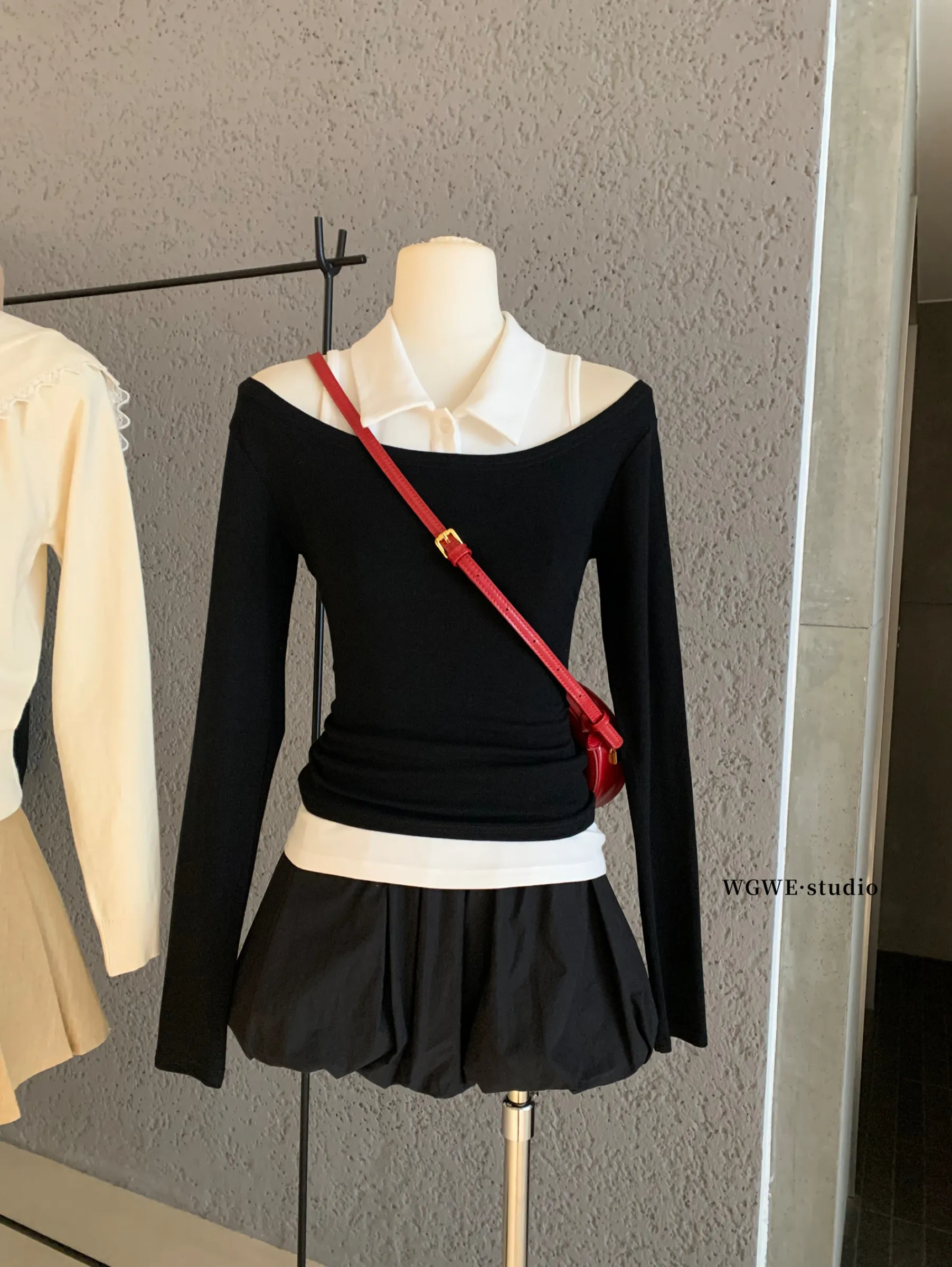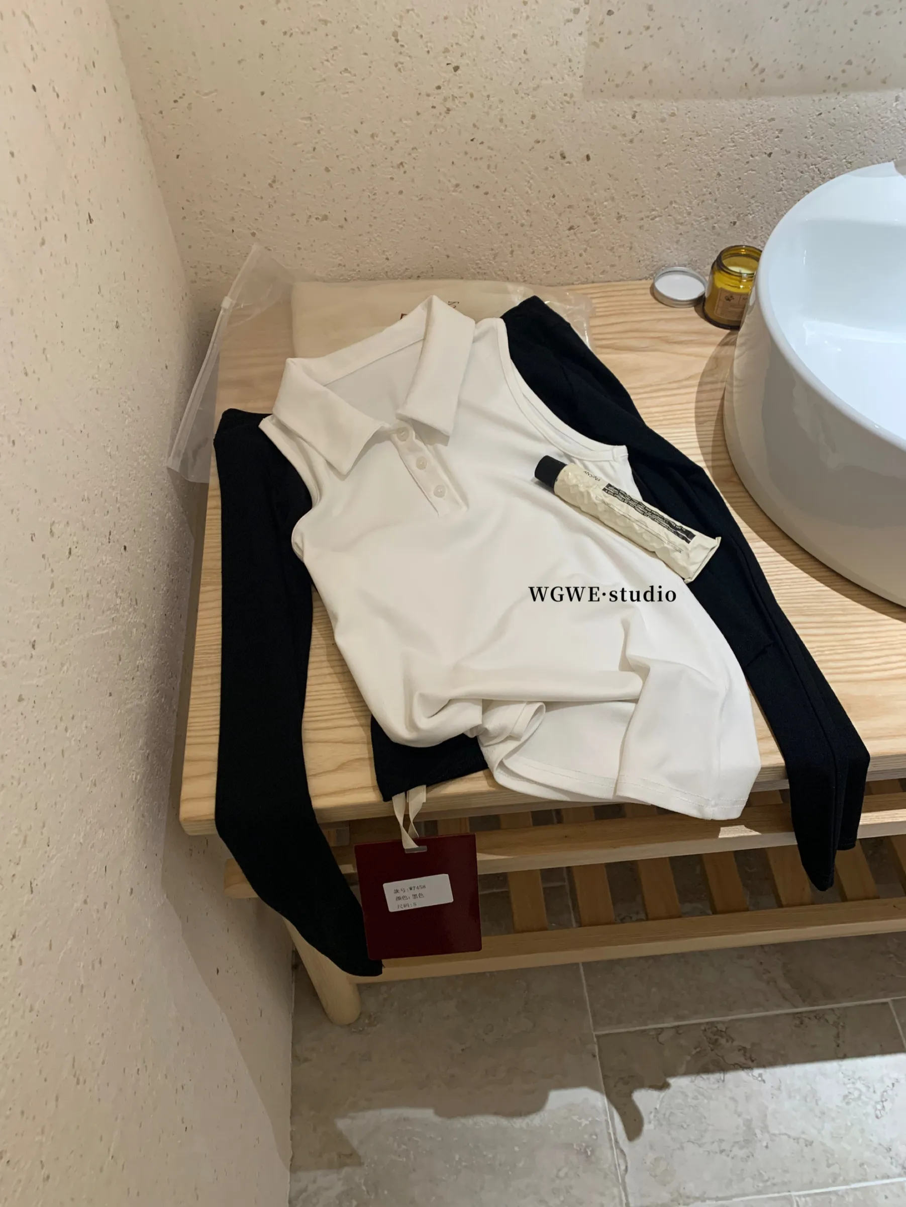 Polo领背心+黑色露肩两件式上衣哟!搭配半裙/短裤就可以🤤拆开的话都是可以另外搭配/单穿的单品呀,性价比很高!