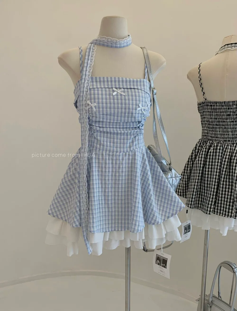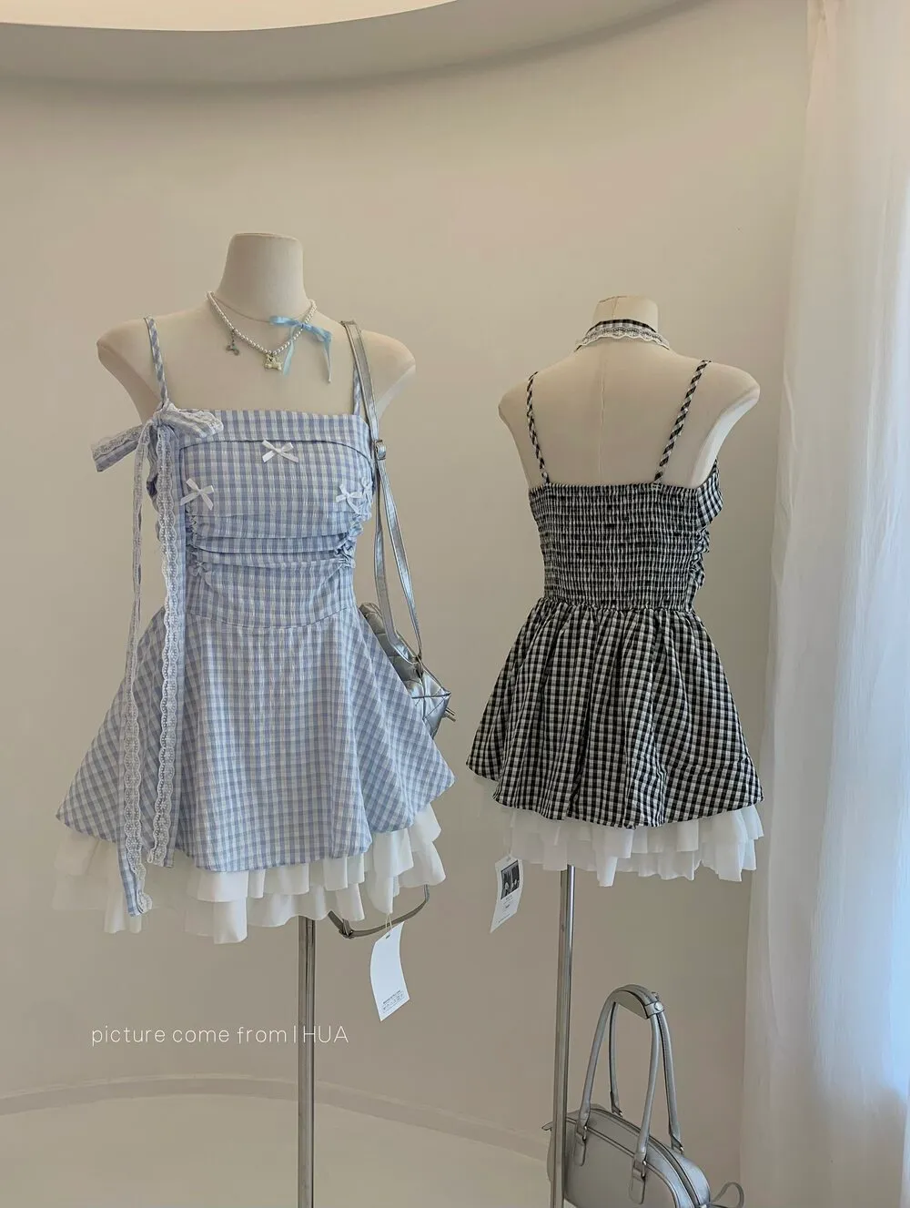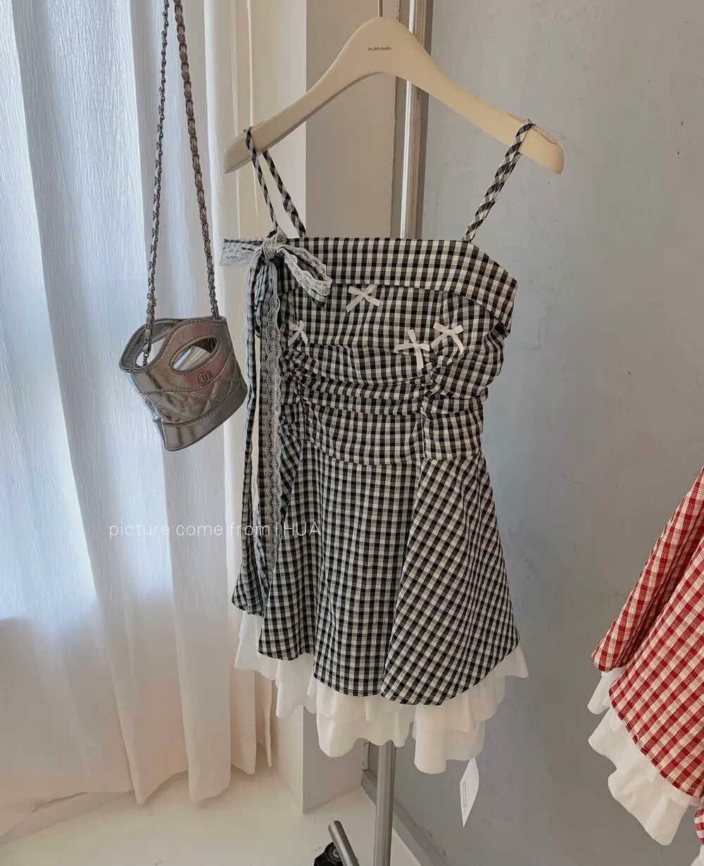 A1786 甜美蝴蝶结吊带格纹蓬蓬裙 | 带胸垫,配飘带🎀