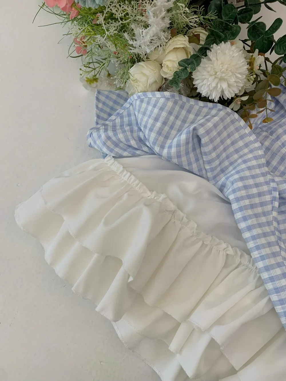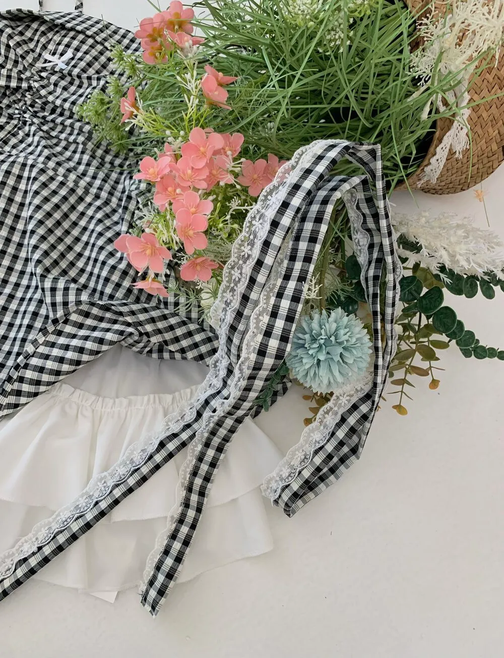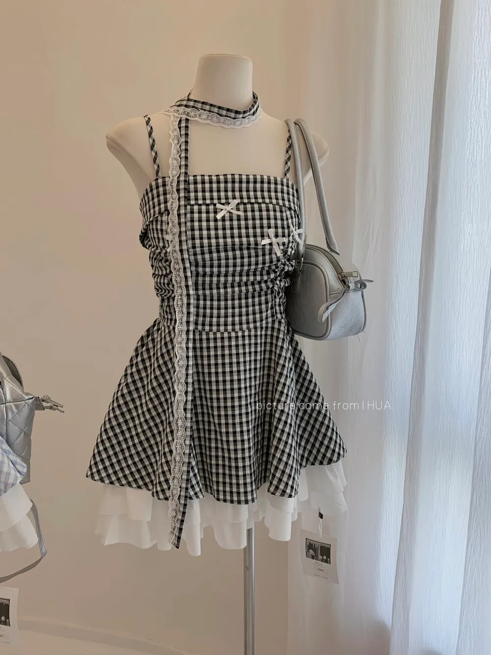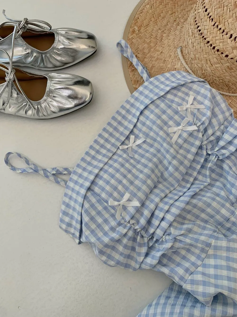 A1786 甜美蝴蝶结吊带格纹蓬蓬裙 | 带胸垫,配飘带🎀