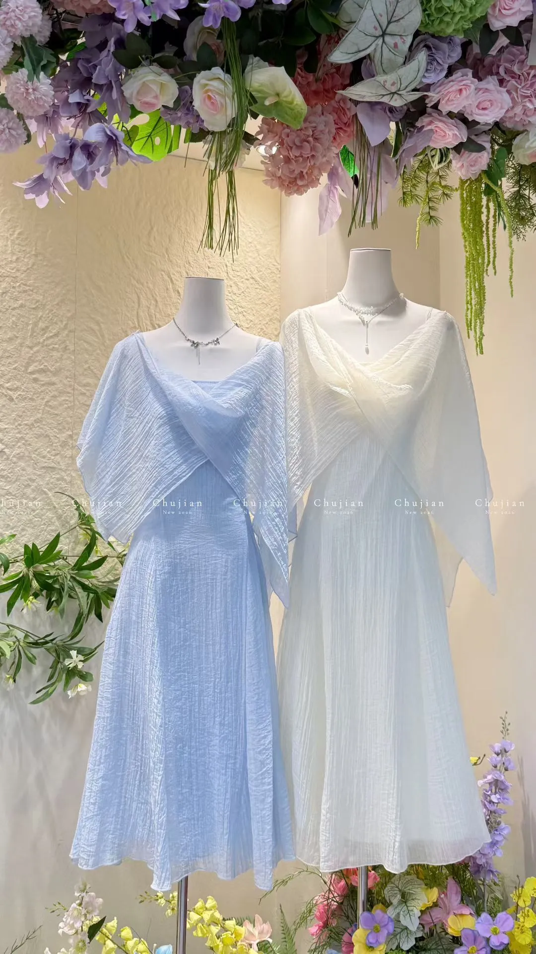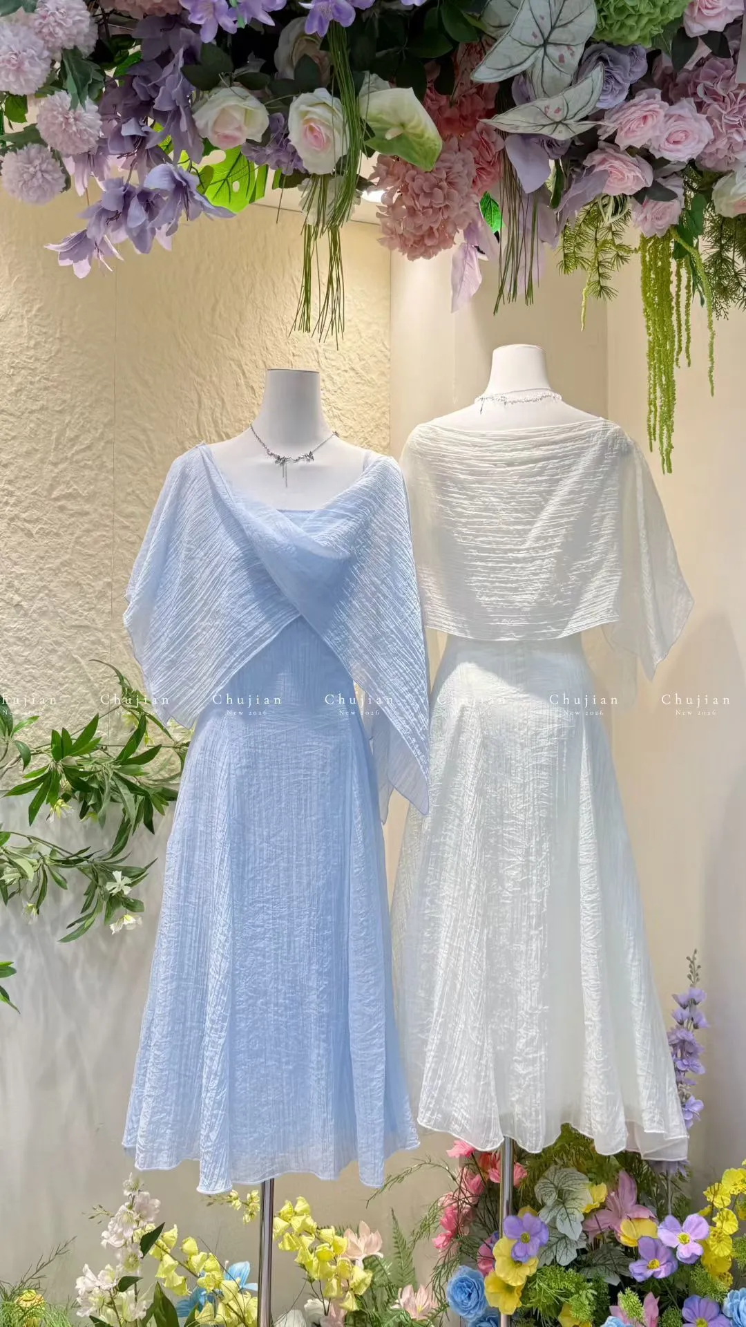 自带仙气的连衣裙🤍dinner度假都可以穿呀!!天丝麻面料有内衬,上身不扎肉,肩带可以调节~搭配的披肩可拆开,有效遮肉肉啊🤤侧边拉链无弹性喔~