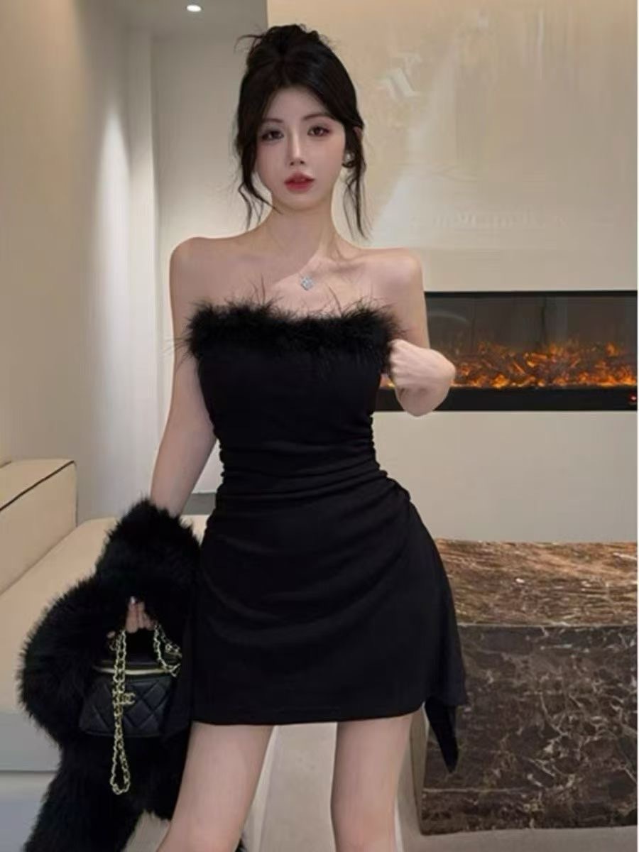A1535 鸵鸟毛羊绒包臀鱼尾小短裙 | 自带胸垫