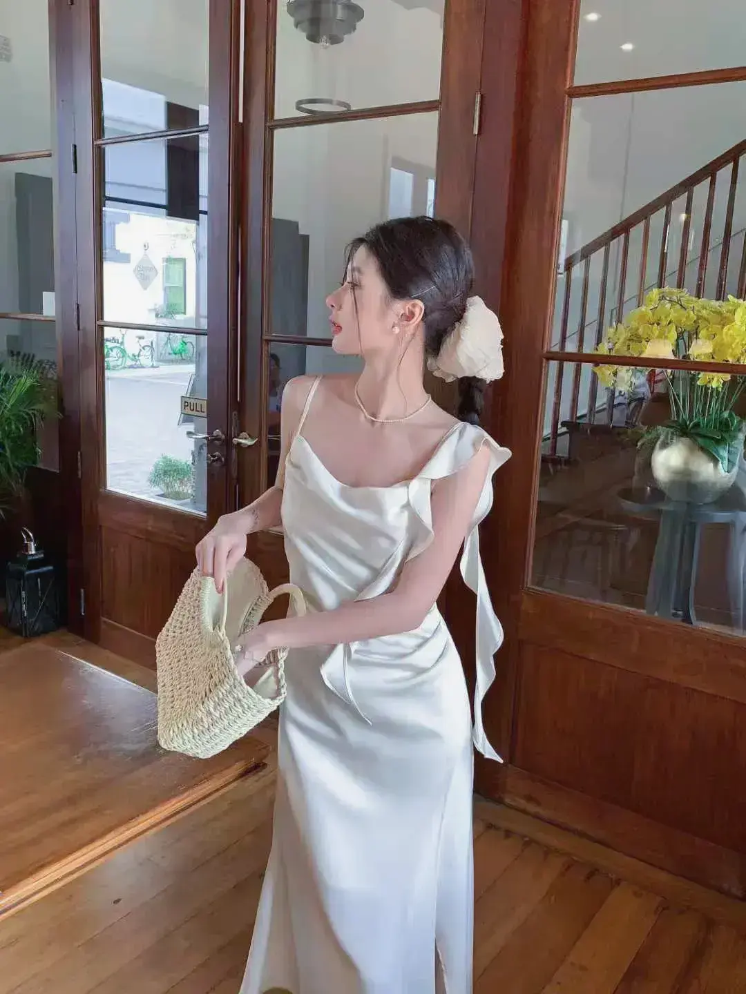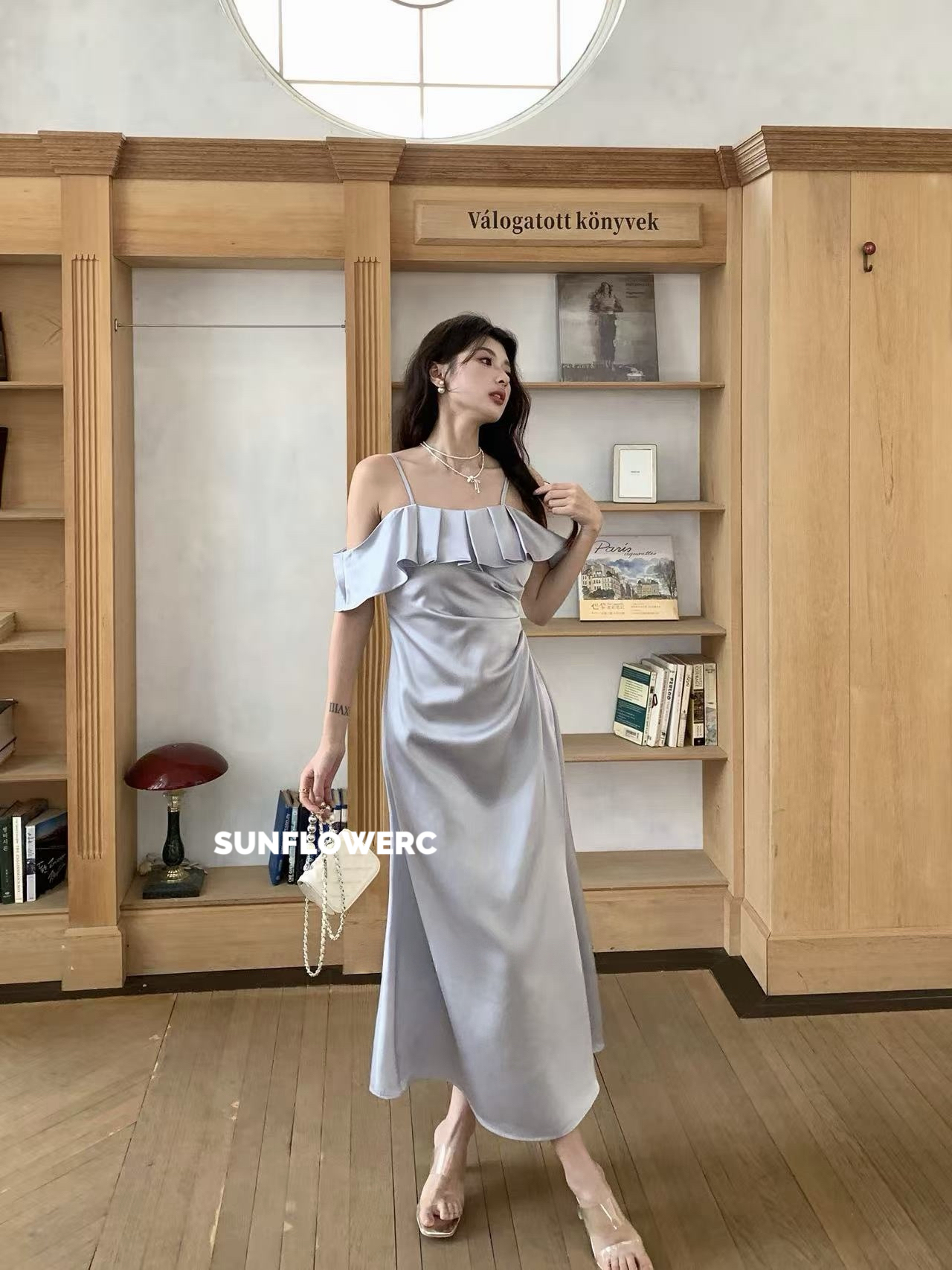 A1446 高级感香槟色缎面吊带小礼服🍷